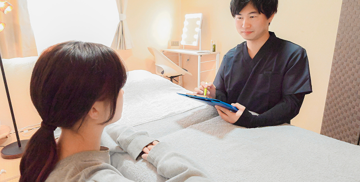 丁寧なアンケートとカウンセリングの結果をもとに、一人ひとりに合わせた施術内容を提供いたします。オーダーメイドだからこそ、効果が出やすい。自分の身体の状態が知れる、カルテを公式Lineから簡単にチェックできる。